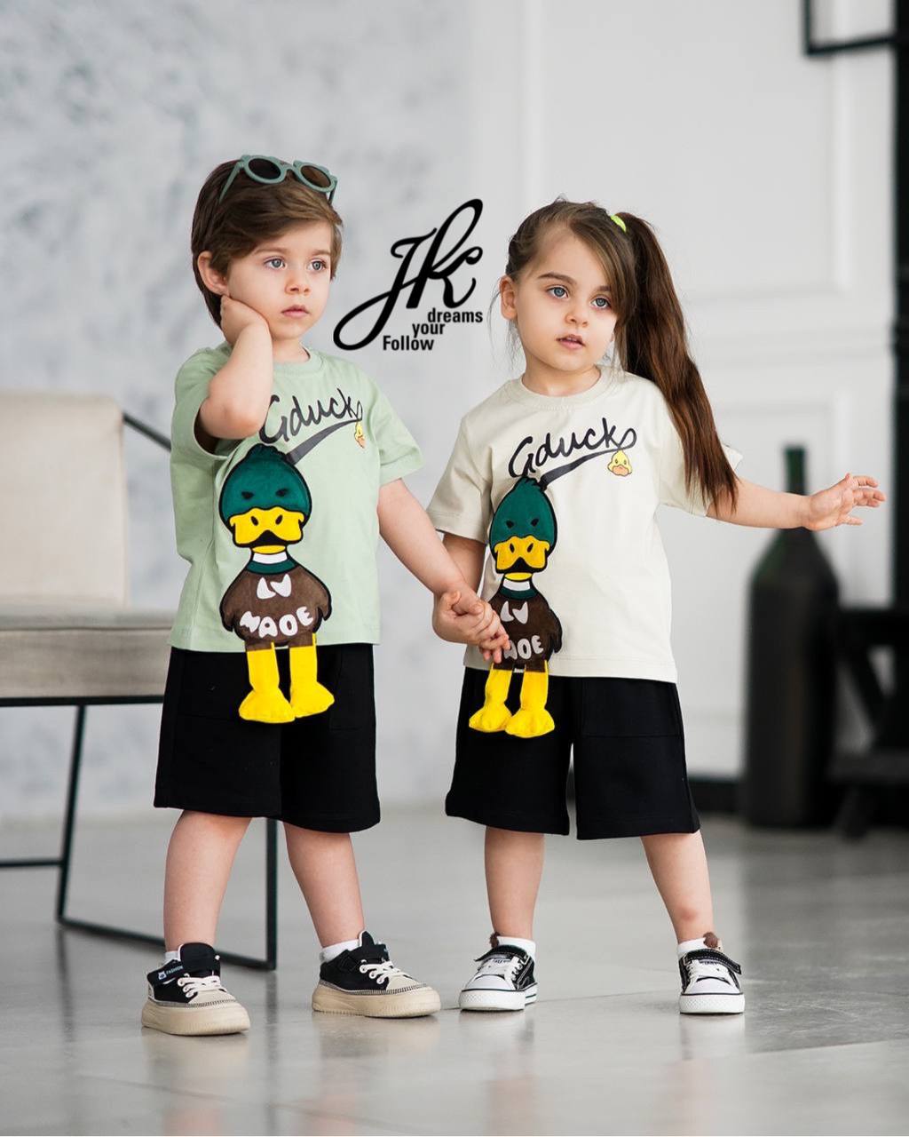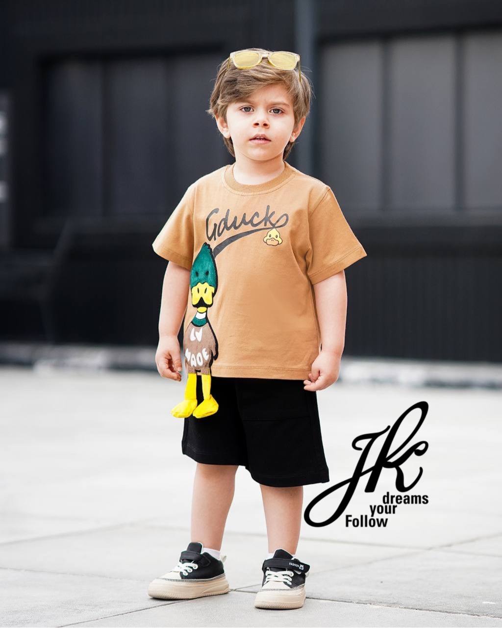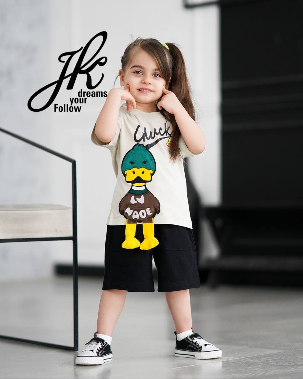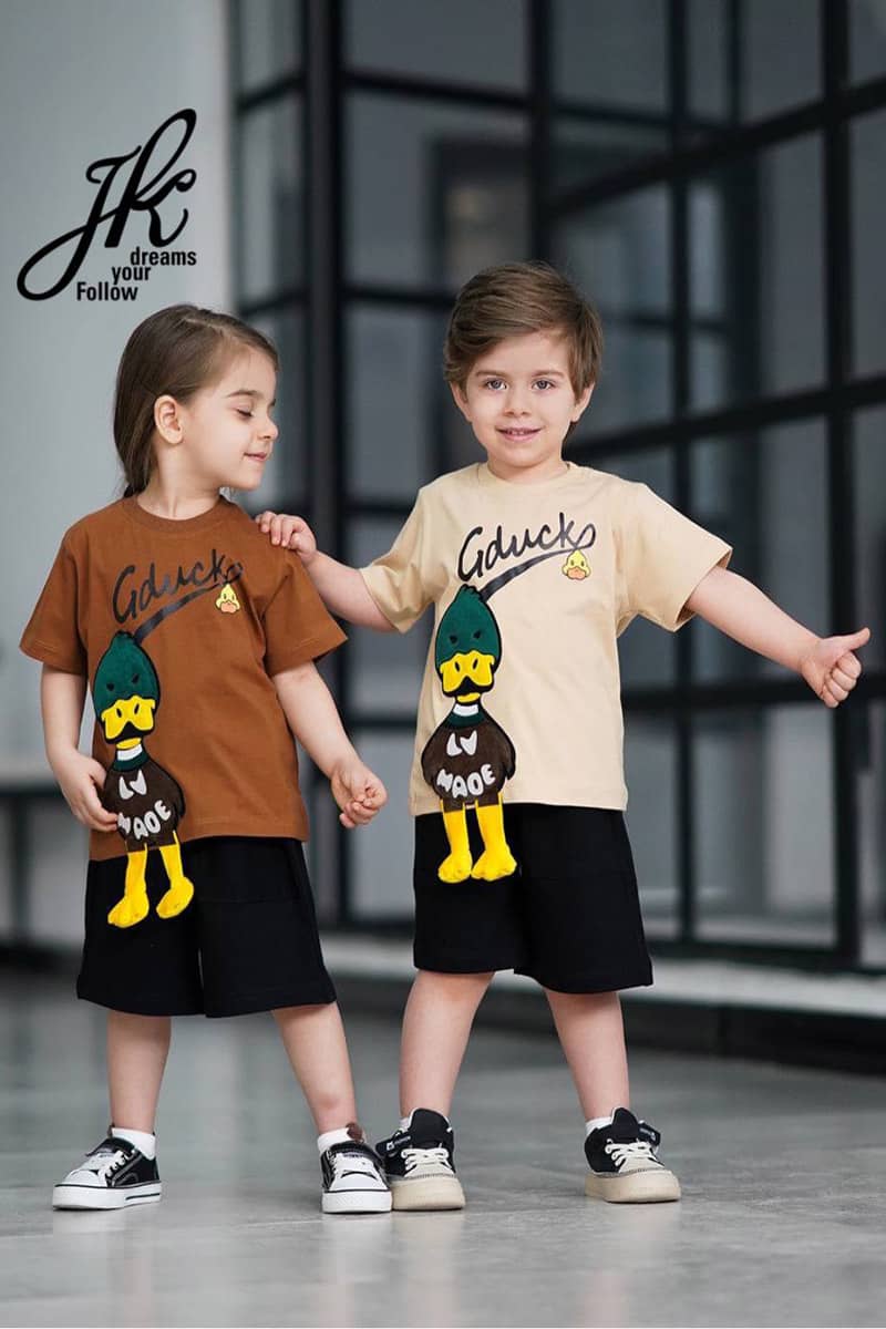 🟠 چاپ زول درجه یک عروسک اردک دوخته شده به لباس قد شلوارک زیر زانو میباشد